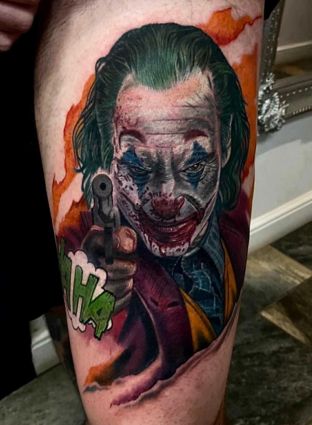 Pictured: Joaquin Phoenix's Joker, a custom design featuring a comic book style "HaHa"