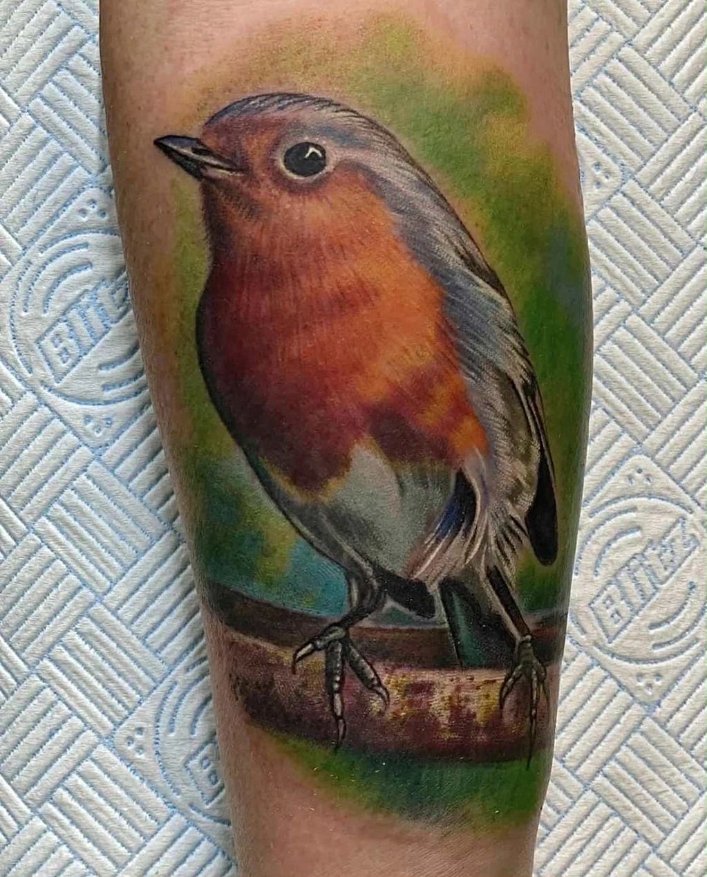 Pictured: A delicate Robin perched on a branch. With a distempered forest background.