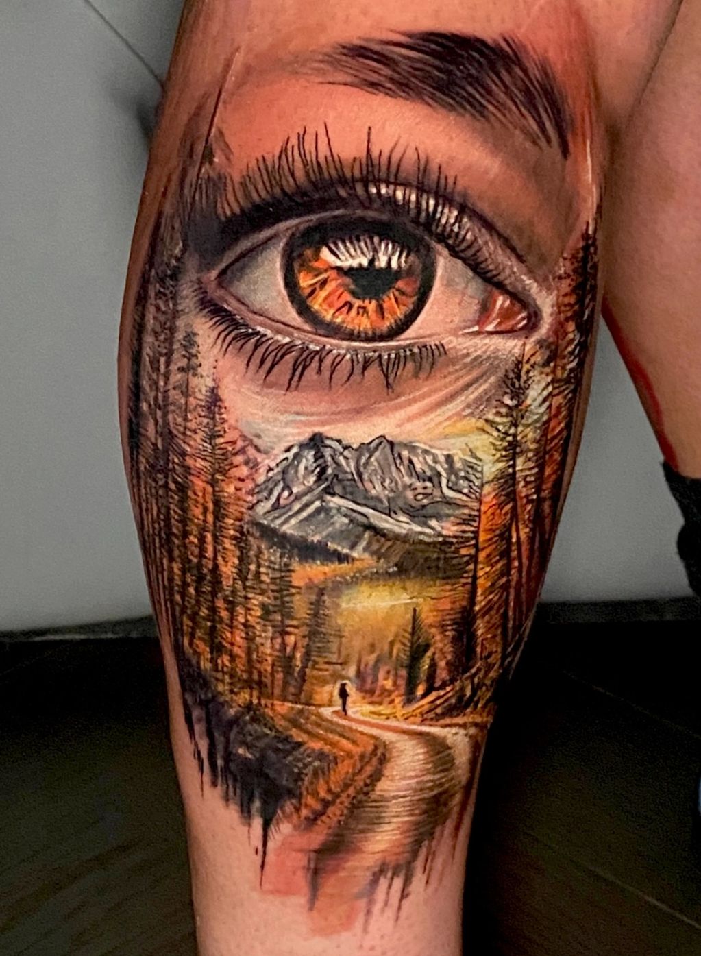 Pictured: A realistic eye encased in the mountains and landscape.